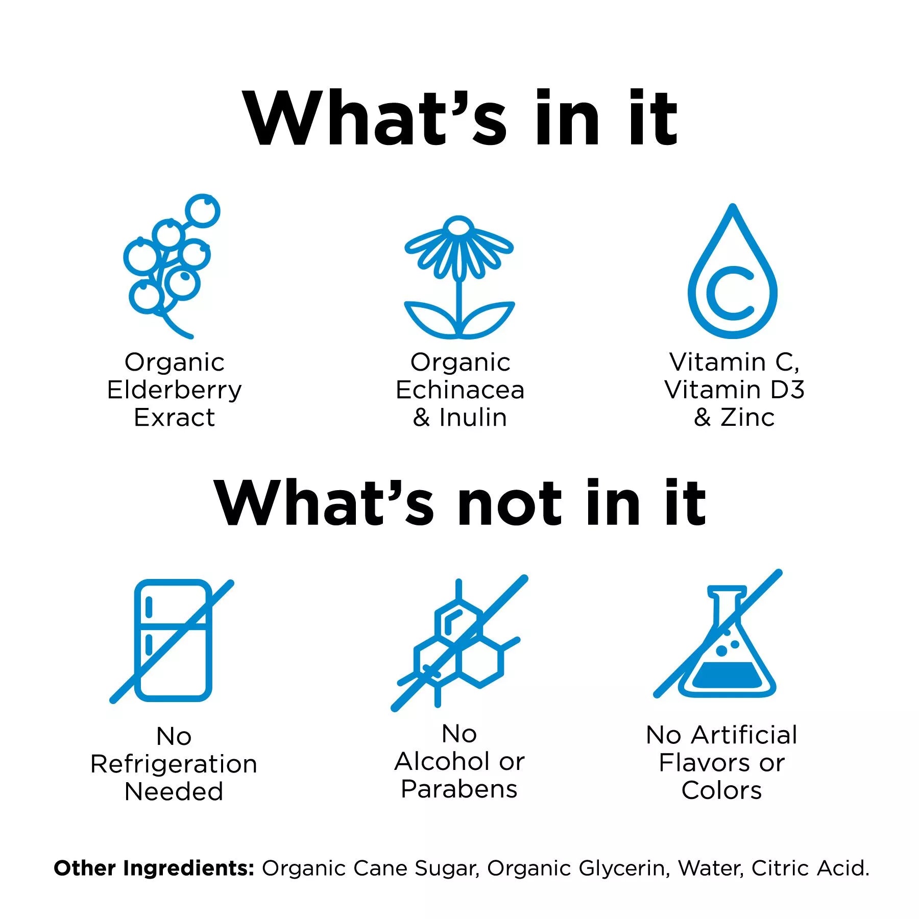 Mommy's Bliss Eldeberry Syrup është suplement i krijuar me ekstrakte të pastër organikë të frutave, si lule shtogu (elderberry) e pasur me antioksidantë.