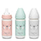 Biberoni rrethor, simetrik me 3 pozicione të ndryshueshme rrjedhjeje ju lejon të përshtateni lehtësisht me ritmin e thithjes nga fëmija duke rrotulluar shishen.
