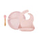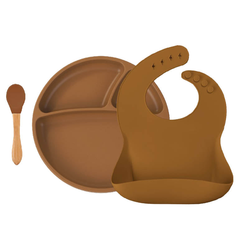 Set ushqimi prej silikoni me dizajn praktik dhe funksional për të inkurajuar bebushët të vetëushqehen. Seti përbëhet nga një pjatë silikoni e ndarë në 3 pjesë me bazë thithëse për ta mbajtur atë të fiksuar në tavolinë, një lugë silikoni me dorezë bambuje dhe një gushore silikoni me bazë të thellë për të mbledhur ushqimet që nuk arrijnë në gojën e fëmijës. Gushorja mbërthehet në qafë në 4 pozicione të ndryshme dhe përshtatet lehtësisht për fëmijë të moshave të ndryshme.