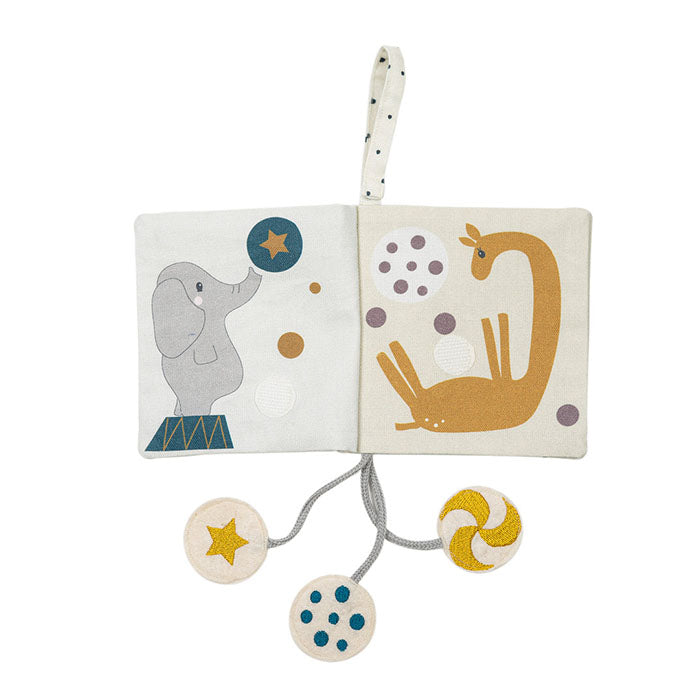 Libër i bukur me printime të ëmbla, faqe që rrudhen dhe me shumë gjëra që ndodhin. Topat mund të hiqen dhe të ngjiten me velcro. Thjesht vendosini ato në pikat e duhura, a mund ta bëni? Lehtë për t’u ngjitur në karrigen ose karrocën e fëmijës suaj. Ofron orë pafund argëtimi dhe në të njëjtën kohë stimulon aftësitë e shkëlqyera motorike dhe shqisën e prekjes.