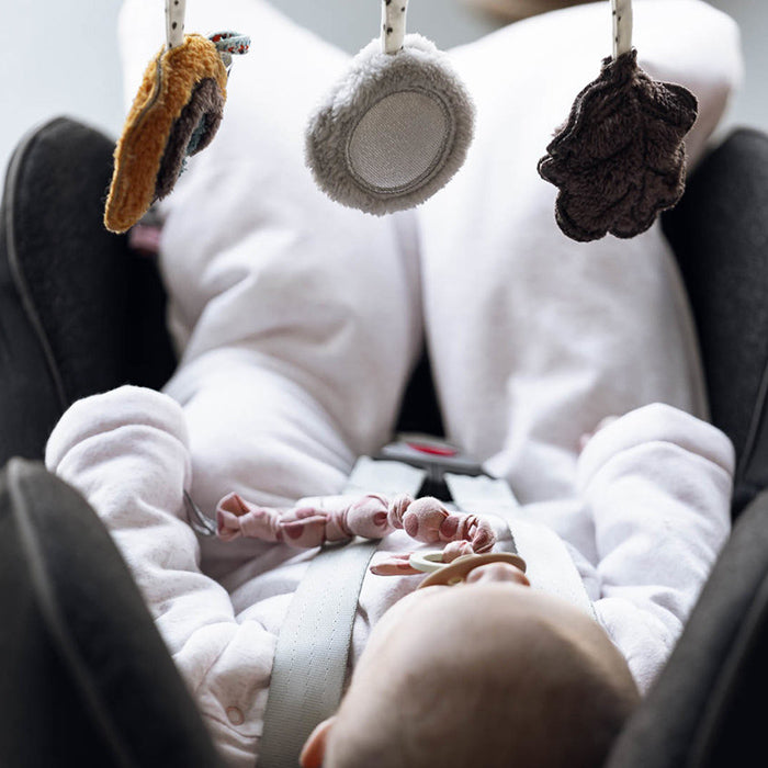 Elegante dhe lozonjare me ngjyra të ngrohta paqësore. E bukur për të luajtur me të, për të prekur, për ta tërhequr ose për ta patë. Me një zile, pasqyrë të vogël dhe s’ka nevojë për të thënë: etiketën Snoozebaby, duke ofruar orë pafund argëtimi dhe në të njëjtën kohë duke stimuluar aftësitë e shkëlqyera motorike dhe shqisën e prekjes.