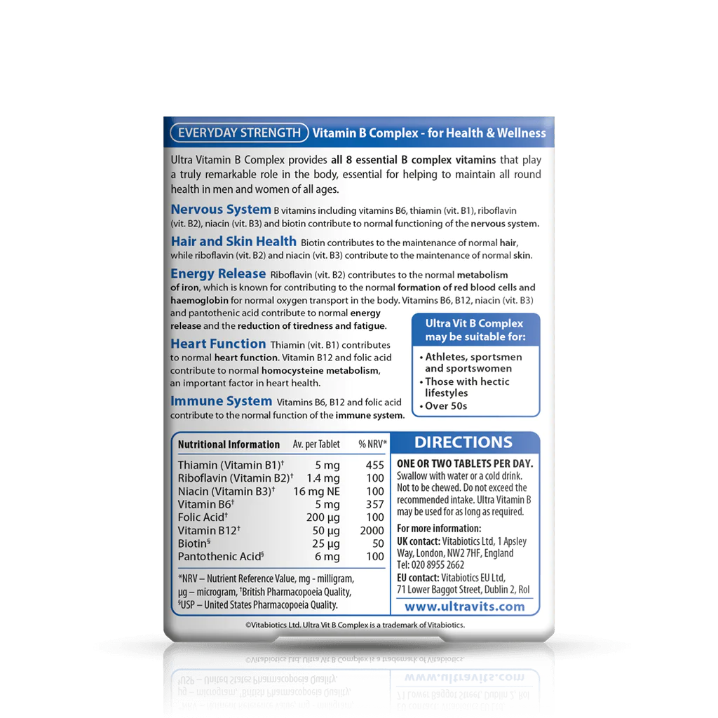Ultra Vit. B Complex përfshin 8 vitaminat esenciale B : Thiamin (B1), Riboflavin (B2), Niacin (B3), Acidin Pantothenic (B5), Pyridoxine (B6), Biotin (B7), Acid Folik (B9) dhe Cyanocobalamin (B12)