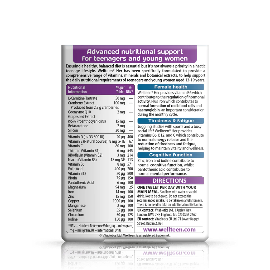 Wellteen Her është zhvilluar veçanërisht për adoleshentet dhe femrat e reja të moshës 13-19 vjeç, duke ofruar një gamë të gjerë të vitaminave, mineraleve, Co-Q10, L-Carnitine, fara rrushi dhe ekstrakt boronice.